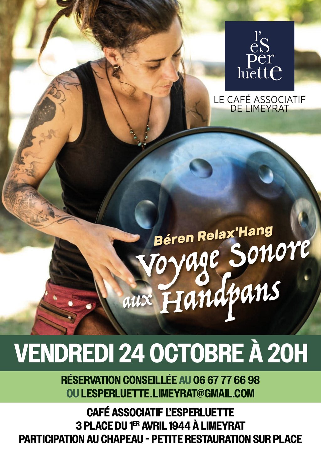 Béren est venue en concert au mois de juin, elle a souhaité revenir à L'Esperluette avec ses handpans, on avait adoré, on espère que vous serez heureux de l'écouter à nouveau ! Vendredi 24 octobre à 20h, petite restauration, participation au chapeau.