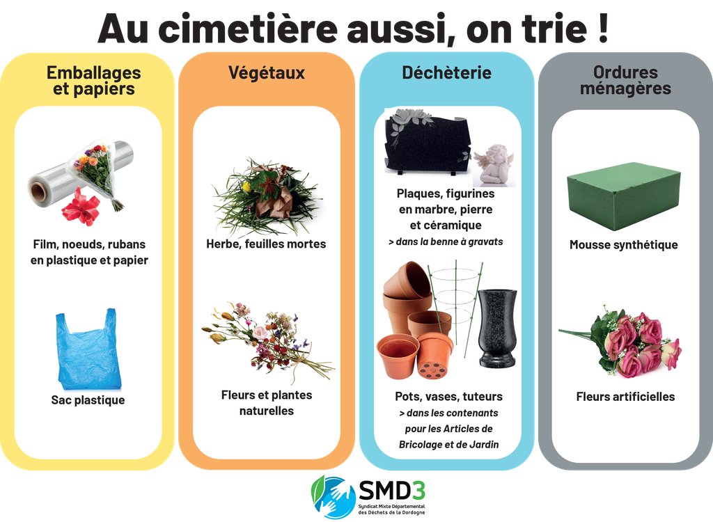 - Dans les déchèteries : plaques funéraires, figurines, vases, tuteurs et pots sont à déposer dans les bennes spécifiques (gravats ou bricolage/jardin).