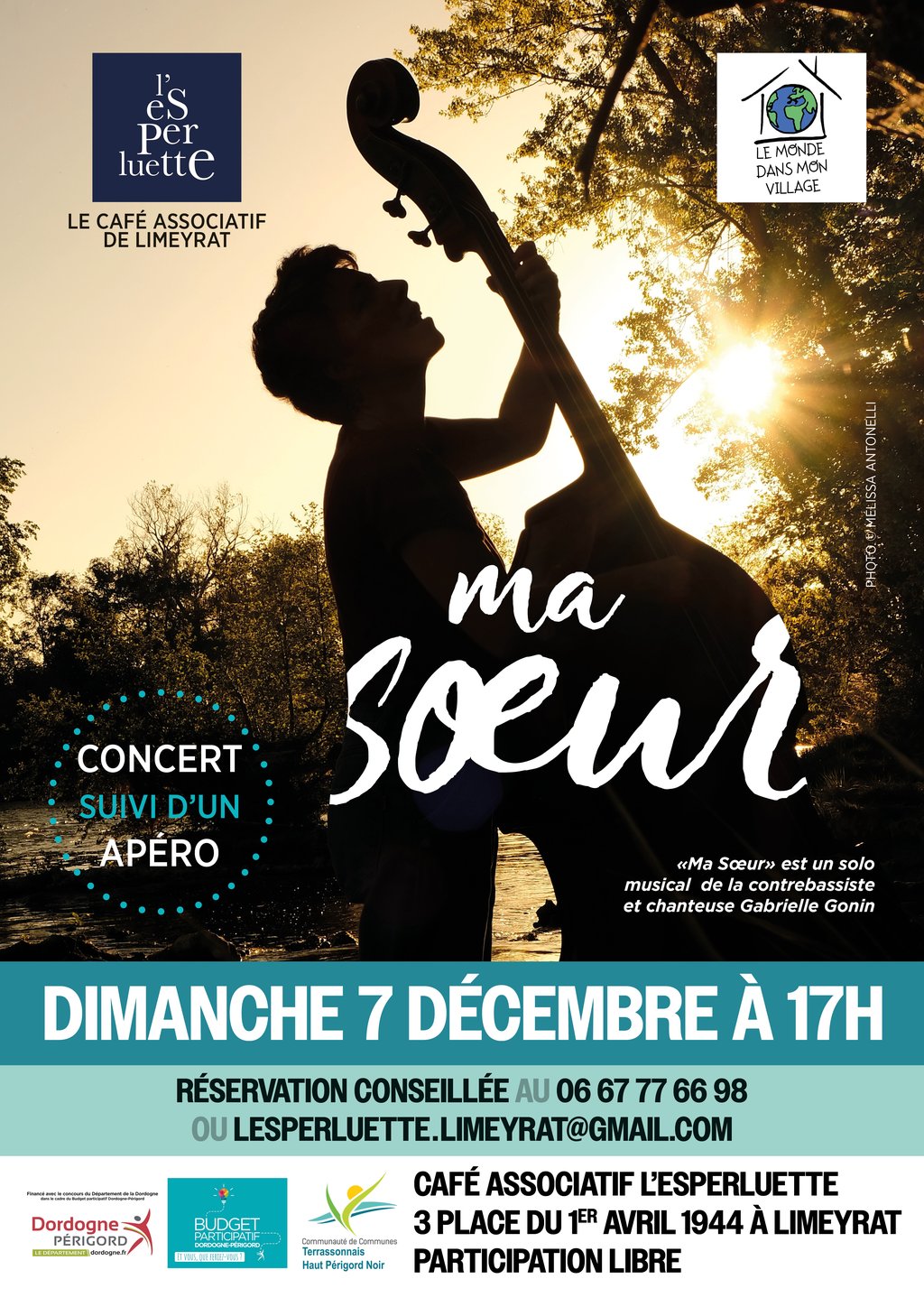 A l'affiche de L'Esperluette le concert Ma Sœur par la contrebassiste & chanteuse Gabrielle Gonin, une soirée en partenariat avec l'association Art de vivre de Brigitte Michal et l'association Le Monde dans mon village de Marina Pommier.